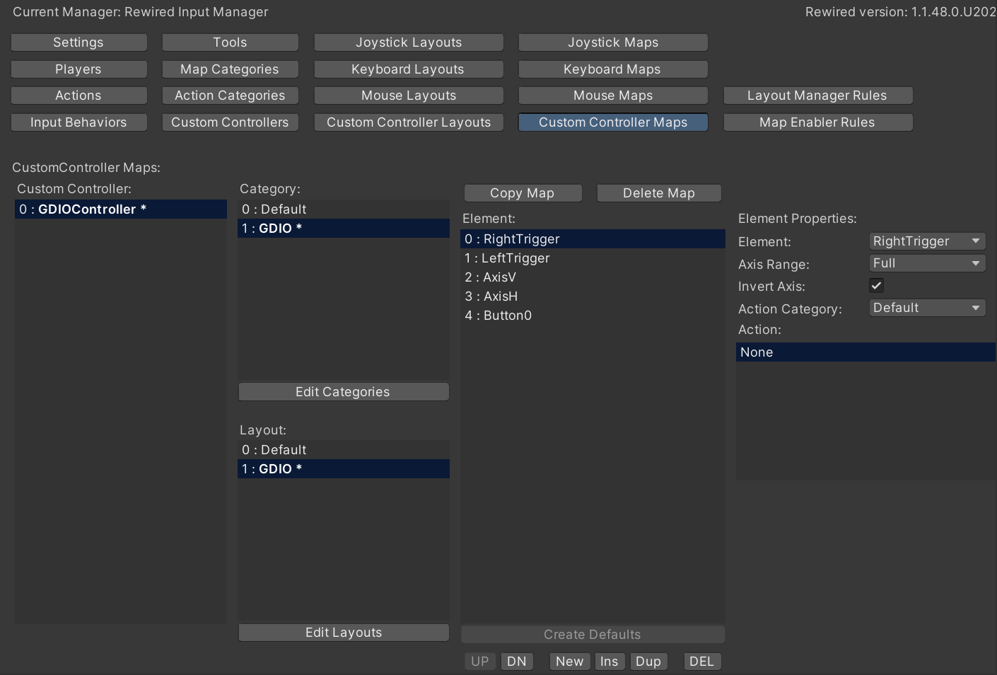 Lastly, move to the "Custom Controller Maps" tab and select the custom controllers that you configured in the previous steps. From here you can either create new categories and layouts in order to define your own custom layouts specific to the GDIO controllers, as shown below, or you can use the Default mappings if you already have them bound to the preferred in-game events.