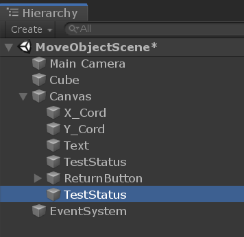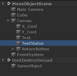 Take the following example. We have an object in a scene that will display some text when certain criteria are met. The object is under MoveObjectScene > Canvas > TestStatus.