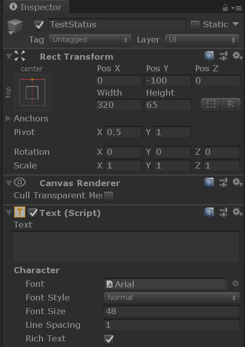 In this example, we’re specifically looking for the value of the text property of a UnityEngine.UI.Text component, which is attached to our TestStatus object as shown here.